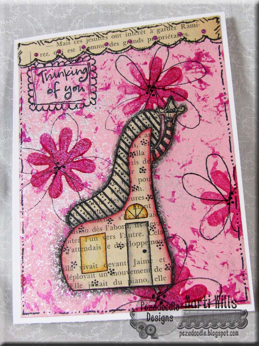 I added some stamped pink flowers and doodled with a black sharpie. i cut my border from an old book page.