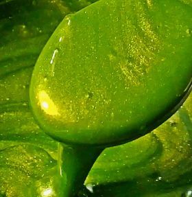 I continued layering - some acrylic paint in pale green and aqua blue, some stamping with waterproof Archival ink and then a full misting with shimmering mist made from Almond Beige Primary Elements Pigment Powder, water and Gum Arabic in a mister. The rose trim for the back of my shoe was white and I wanted all my trim off-white so I soaked it with the same Almond Beige mist. Next I misted Fern Radiant Rain through a diamond stencil and then sponged on Fern Silks (for a darker look) through some sequin waste. I finished my layering up with Radiant Gel in African Jade through a honeycomb stencil - I love adding that bit of raised texture.